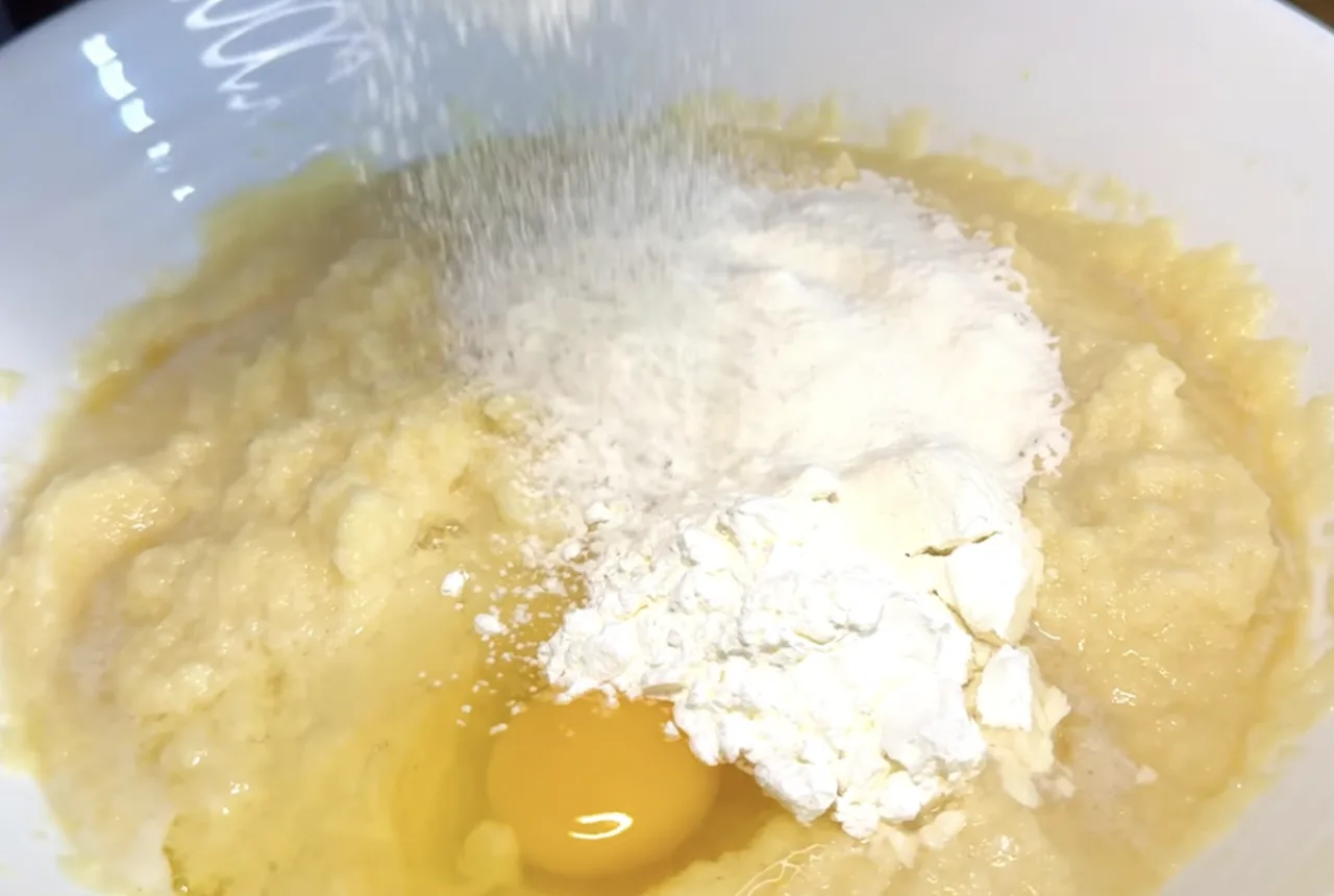 Спочатку натерти цибулю — саме вона не дає картоплі темніти. Картоплю натерти на дрібній тертці та одразу з’єднати з цибулею. Додати яйце, сіль, перець, борошно та крохмаль. Добре, але швидко перемішати до однорідності.