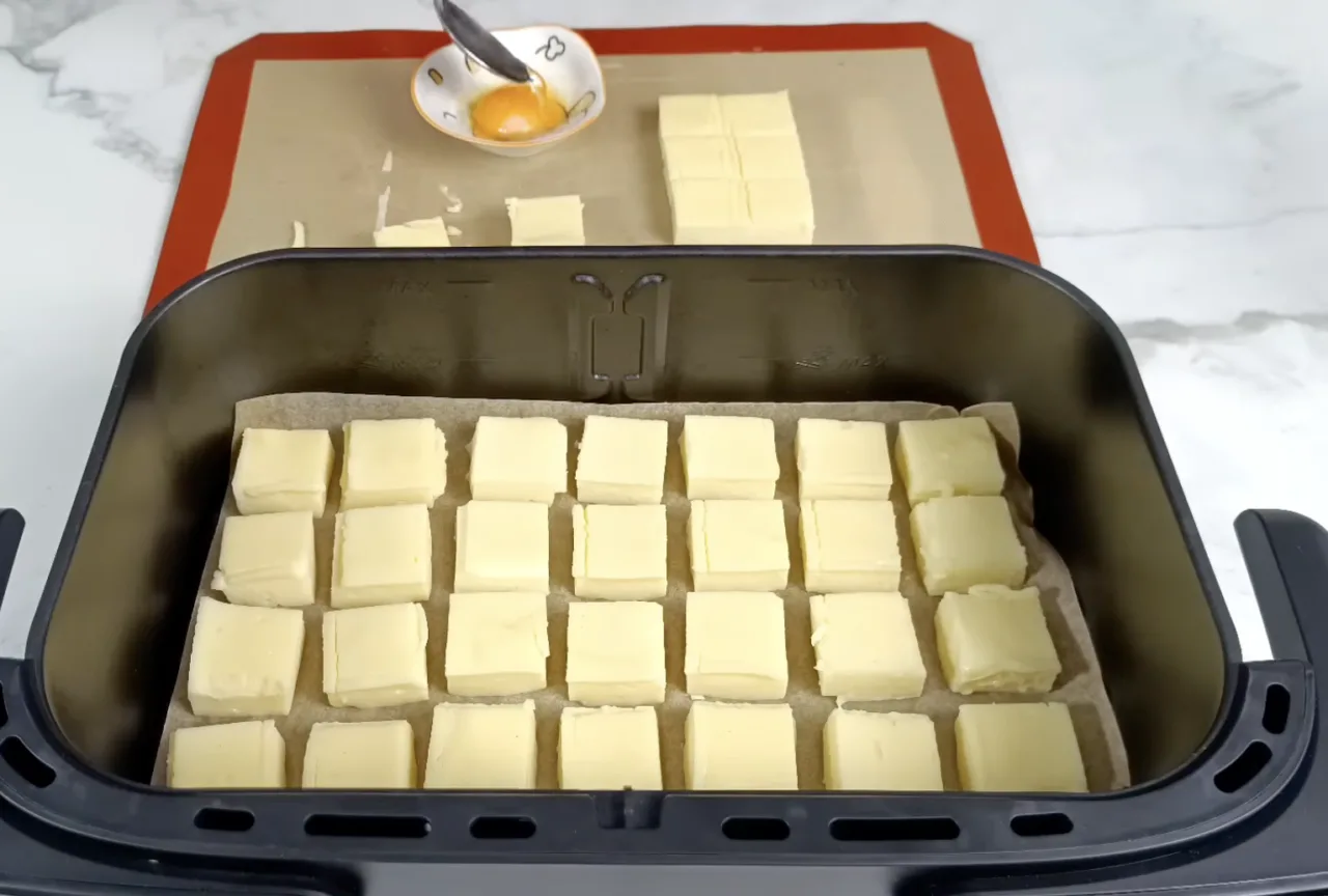 Охолоджений крем дістати з форми, нарізати на невеликі шматочки та викласти на пергамент з відстанню між ними. Жовток змішати з водою і змастити поверхню кожного шматочка.