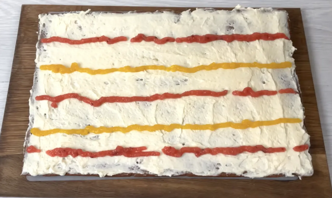 На корж нанесіть тонкий шар крему, зверху відсадіть смужки яблучної маси. Накрийте наступним коржем і повторюйте шари, доки не використаєте всі інгредієнти.
