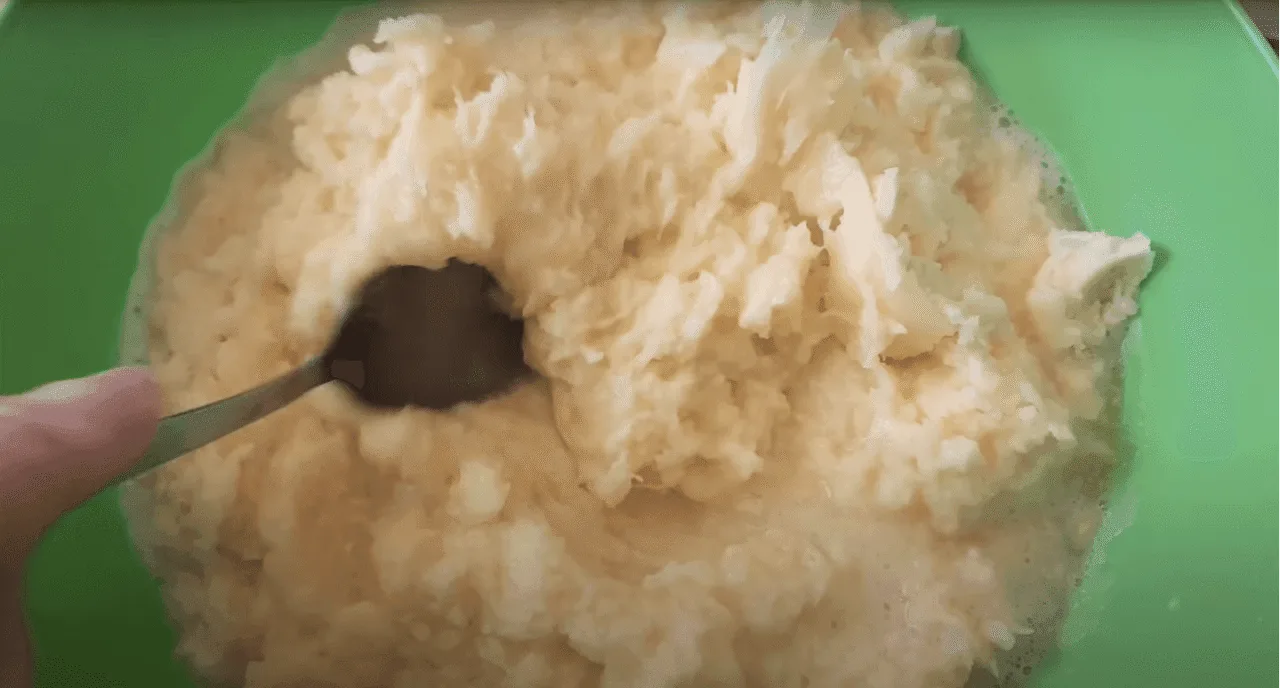 Сиру картоплю натерти разом із цибулею та часником. Це можна зробити за допомогою тертки, або комбайна. Натерту масу перемішуємо ложкою, ніякої рідини не зливаємо.