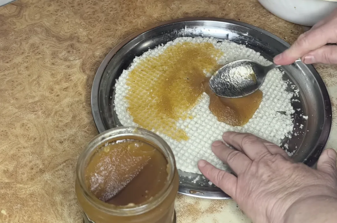 Вафельну основу кладуть у роз’ємне кільце або форму. Зверху викладають начинку з кукурудзяних паличок і добре утрамбовують ложкою або руками, щільно заповнюючи всі порожнини. Дуже важливо добре спресувати масу — тоді вафлі гарно триматимуть форму й красиво нарізатимуться.
