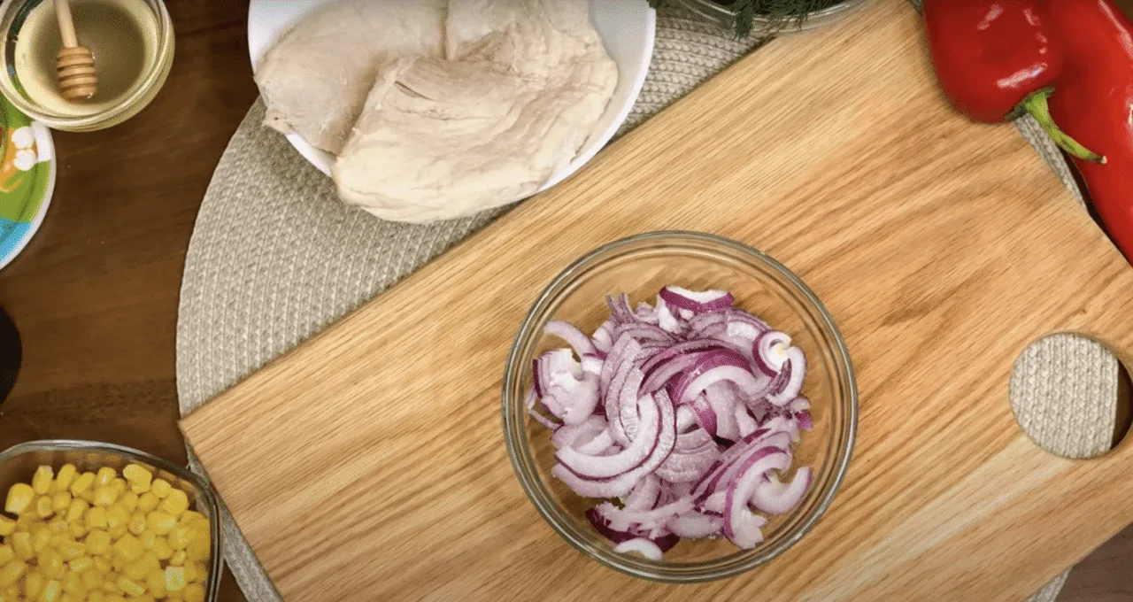 Нарізаємо фіолетову цибулю півкільцями і маринуємо.