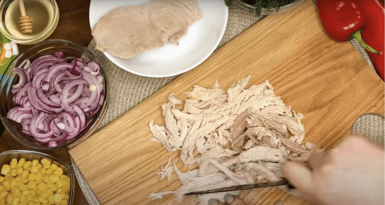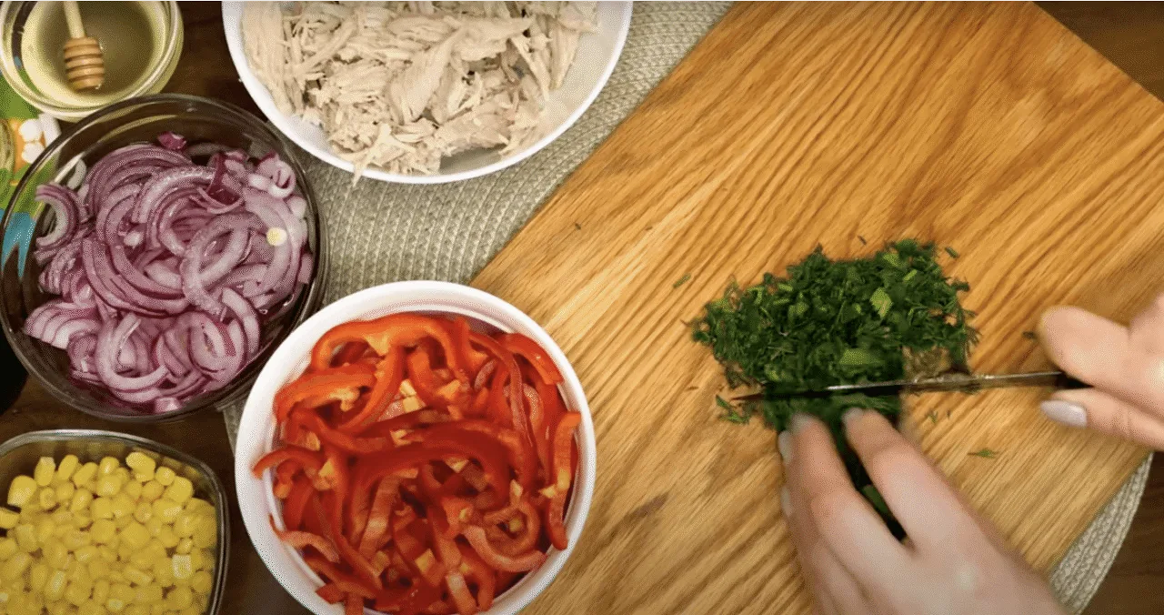 Викладаємо всі інгредієнти в миску, не забуваємо додати кукурудзу, заправляємо соусом та перемішуємо. Подаємо до столу!