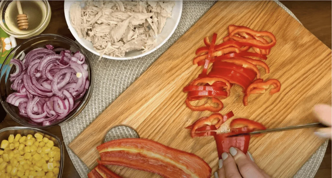 Нарізаємо болгарський перець соломкою.