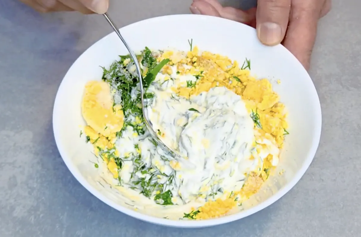 Для соусу змішайте жовтки, грецький йогурт, кріп, посоліть за смаком і добре перемішайте.