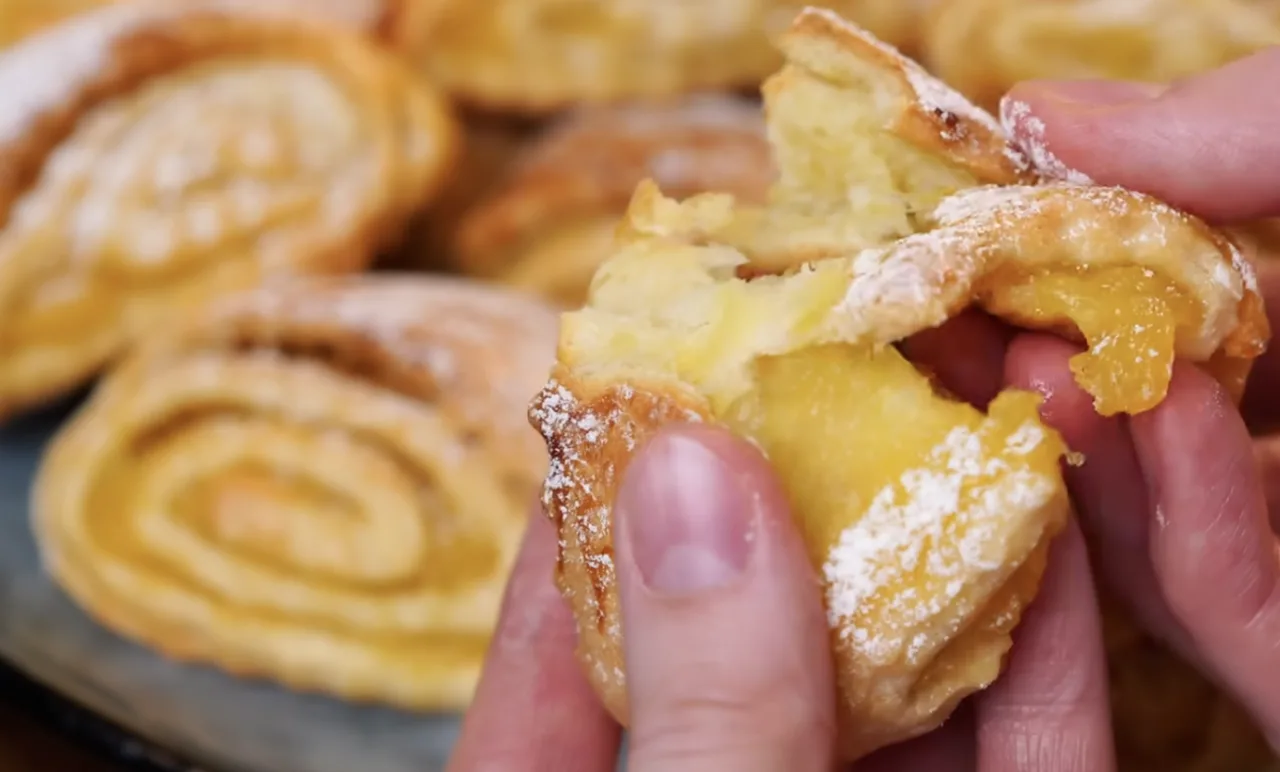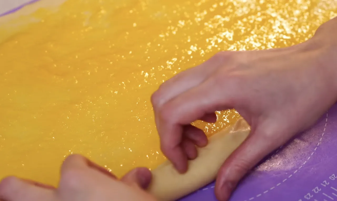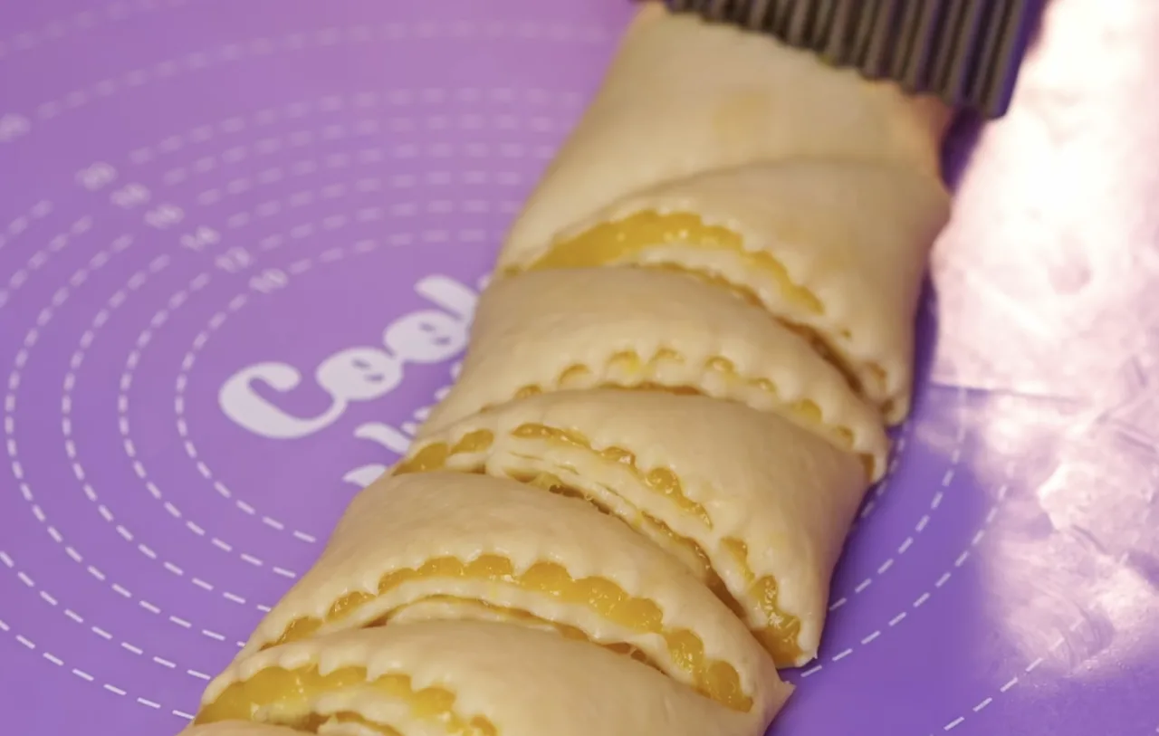 Розкачати тісто в пласт, викласти начинку, скрутити рулетом, нарізати печиво.
