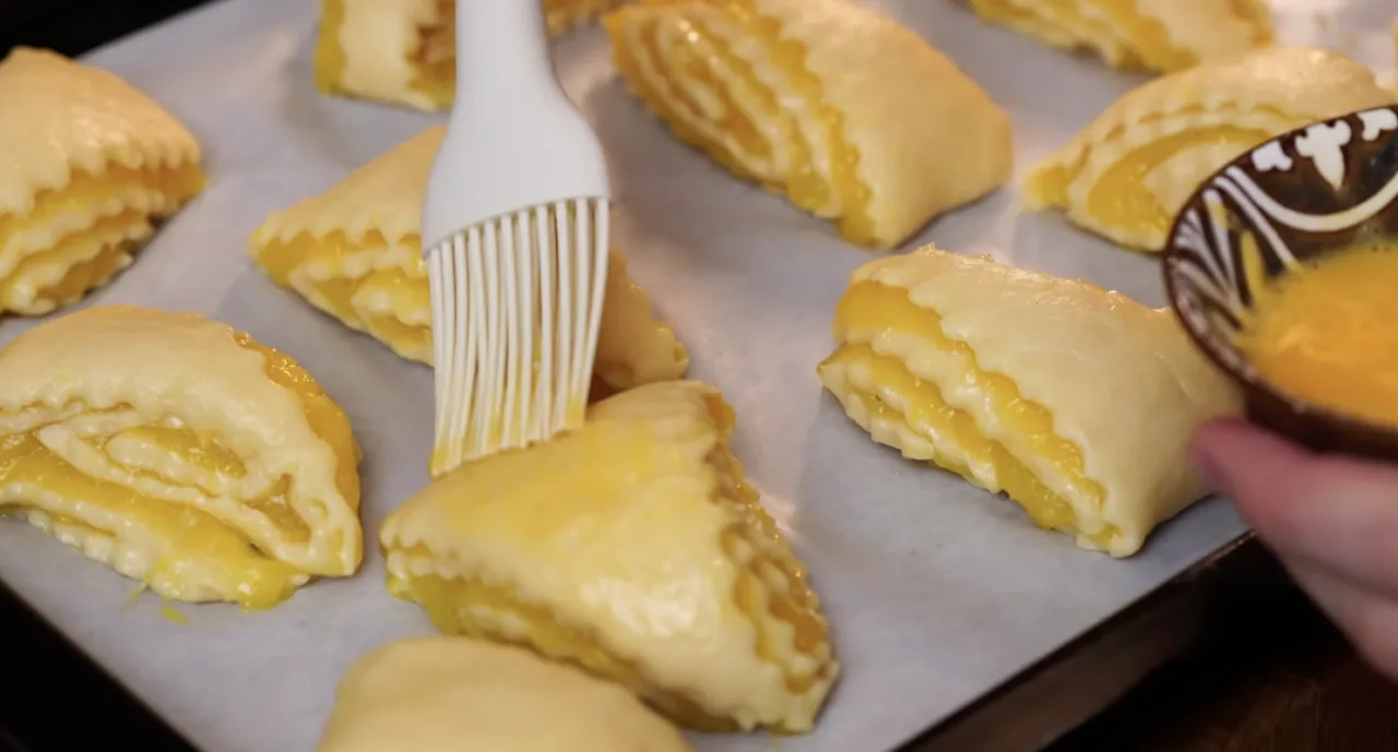 Викласти на деко, застелене пергаментом, змастити печиво (1 жовток + 1 ч.л. молока) і випікати при 180°C близько 35 хвилин.