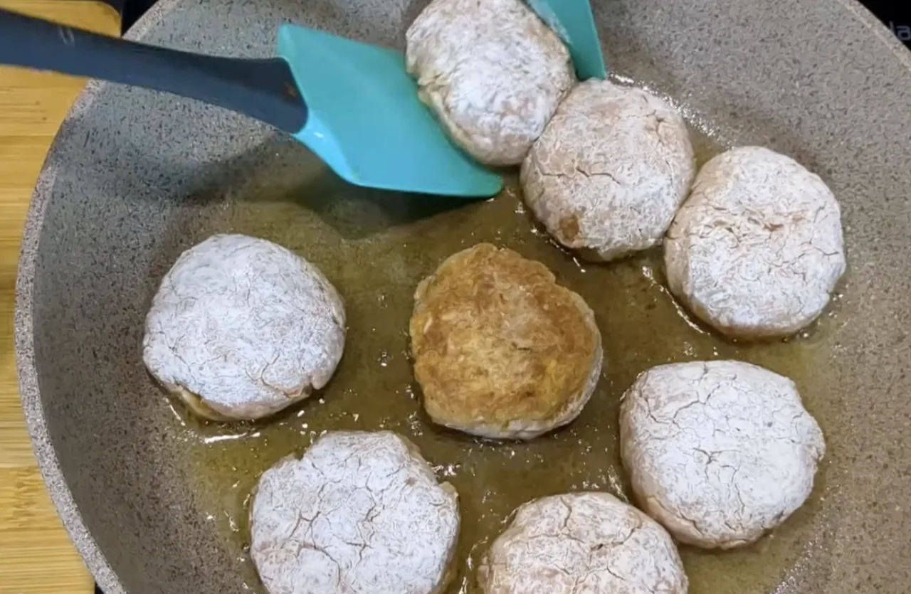 Набираємо повну столову ложку фаршу, кладемо в борошно і обвалюємо. Формуємо кульки, майбутні тефтелі. Наливаємо на сковороду олію пару столових ложок. Розігріваємо та викладаємо тефтелі. Потужність плити зменшуємо, щоб тефтелі не підгоріли. Обсмажуємо тефтелі з двох боків до рум’яної скоринки.