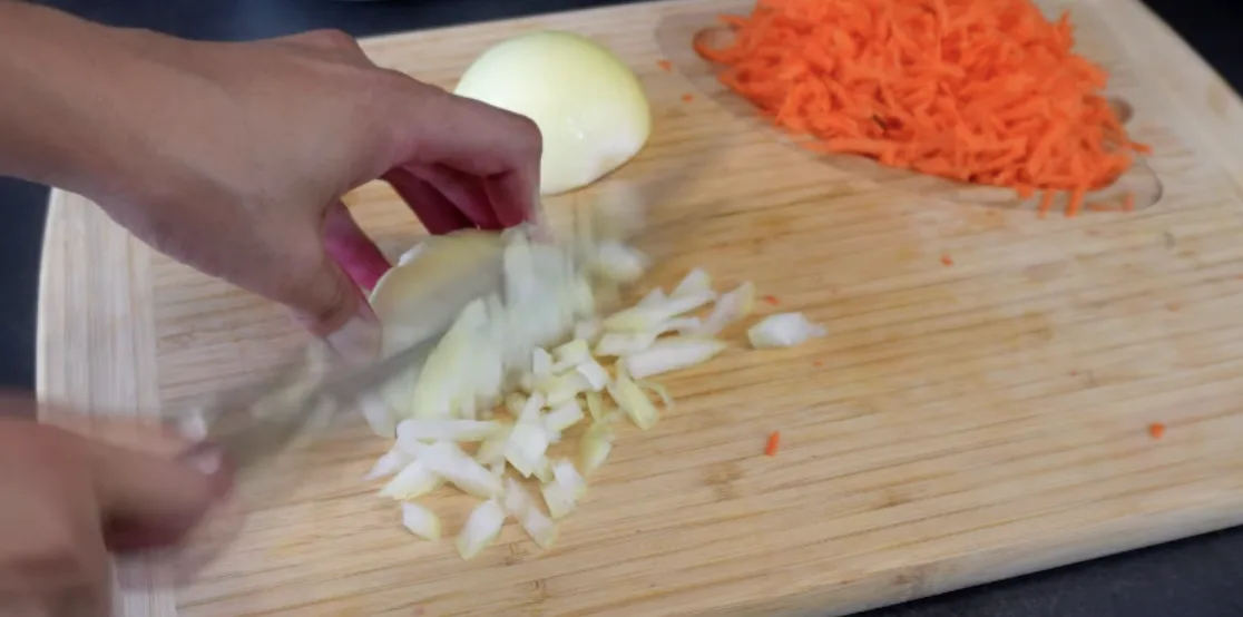 На сковороду наливаємо олію, обсмажимо цибулю до напівпрозорості, додамо моркву обсмажимо ще пару хвилин до м’якості.