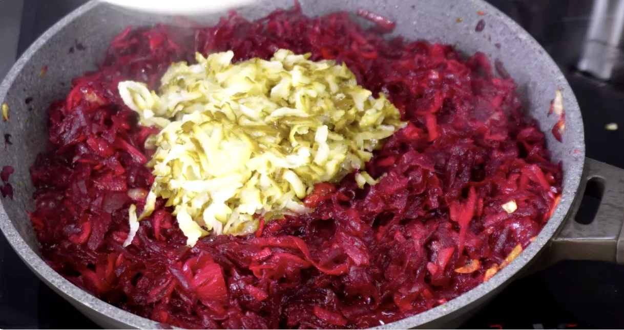 Тепер додаємо буряк і додаємо маринований огірочок, 1 ст. л. томатної пасти, сіль за смаком, я додам 1 неповну ч. л. і цукор теж до смаку, я приблизно додам 1/3 ч.л.