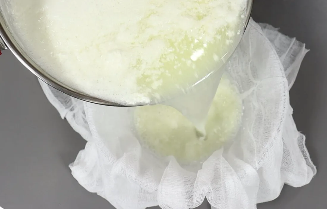 Переливаємо гарячу масу в миску, застелену марлею на кілька шарів.