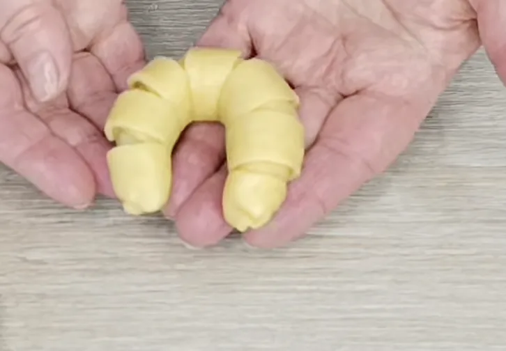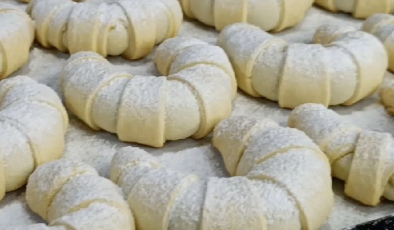 Викладіть рогалики на деко з пергаментом. Випікайте при 180 °C 25–30 хвилин до легкого золотистого кольору. Остудіть, за бажанням посипте цукровою пудрою.