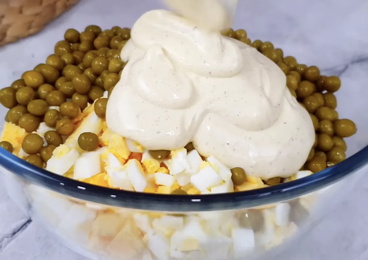 У великій мисці змішайте оселедець, яйця, цибулю та консервований горошок. Додайте сметану, майонез і гірчицю. Посоліть та поперчіть за смаком. Добре перемішайте.