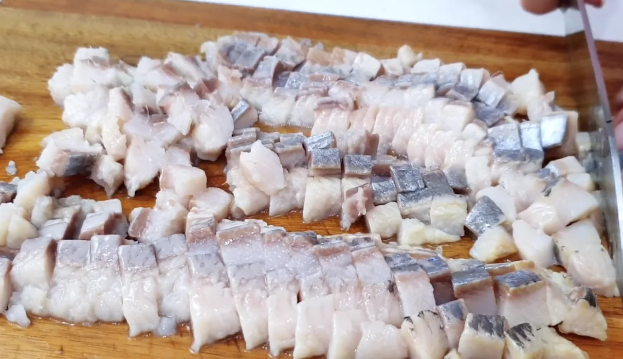 Філе оселедця наріжте невеликими шматочками. Яйця відваріть, охолодіть і наріжте кубиками.