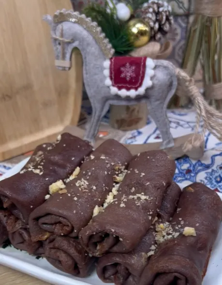 На кожен млинець намасти начинку, посипати грецькими горіхами і загорнути.