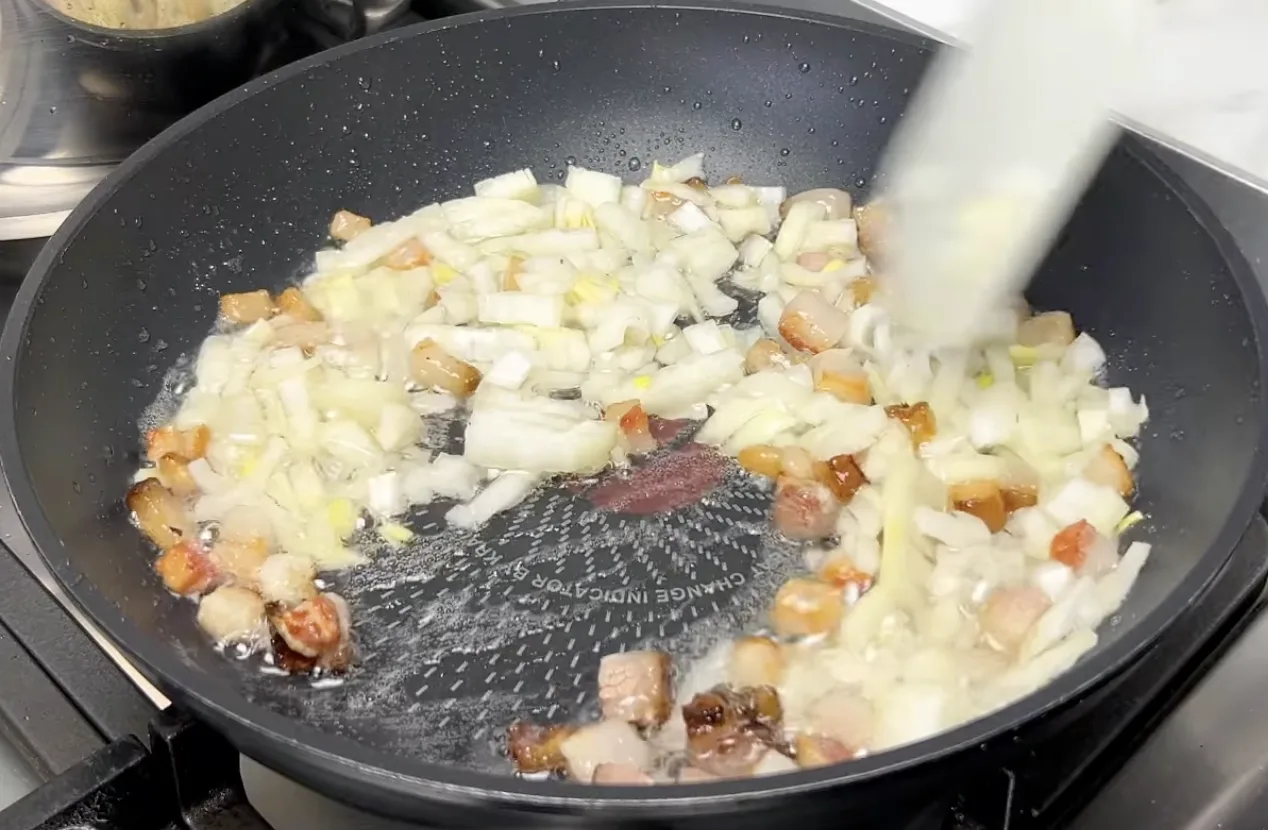 Нарізане сало підсмажуємо до легкого топлення жиру, додаємо цибулю і пасеруємо до прозорості. Важливо: цибулю не треба обсмажувати до золотистого кольору, її завдання — підкреслити аромат супу.