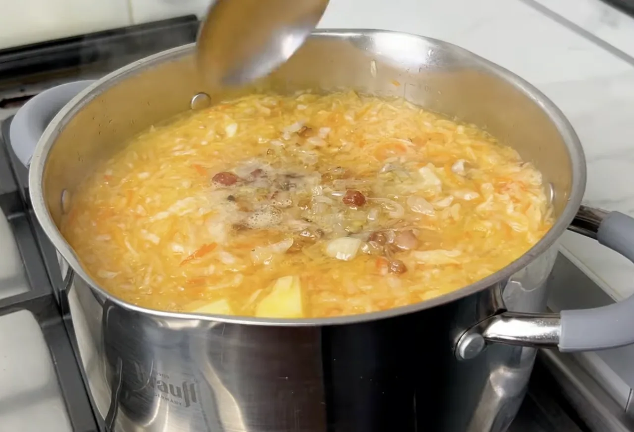 Додаємо капусту (разом з невеликою кількістю розсолу) у суп і варимо ще 10–15 хвилин. Це головний інгредієнт, який надає капусняку характерну кислинку. Наприкінці додаємо засмажку, лавровий листок і дрібку цукру для балансу смаку. Далі вимикаємо вогонь і даємо супу настоятися 10–15 хвилин, щоб він став наваристим і ароматним.