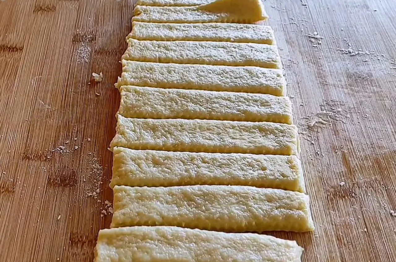 Розкачуємо тісто в прямокутний пласт товщиною 1 см. Ділимо пласт на невеликі смужки та викладаємо їх на деко, застелене пергаментом.