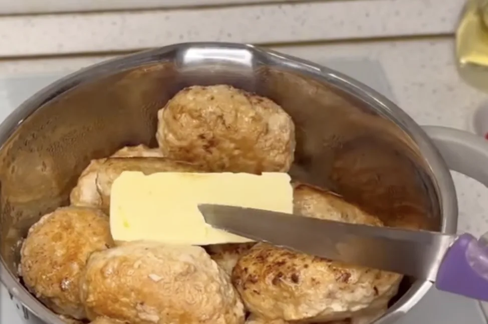 Готові котлети перекладаємо в каструлю. Коли всі котлети обсмажені, додаємо до них воду та шматочок вершкового масла. Накриваємо кришкою і тушкуємо на слабкому вогні приблизно 7 хвилин.