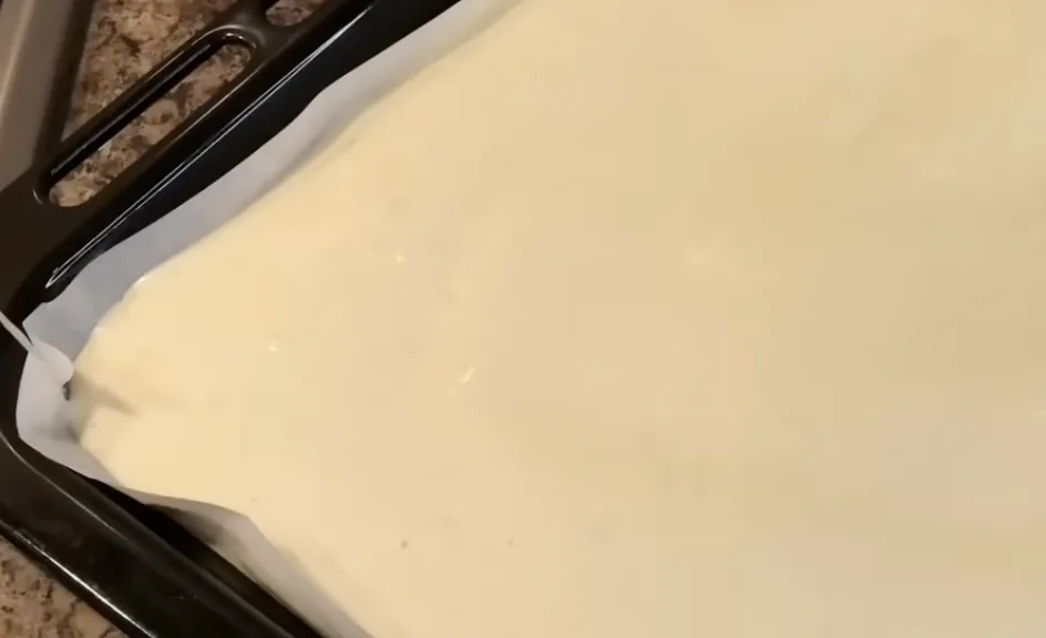 Борошно змішую з розпушувачем і поступово всипаю до яєчної маси. Вимішую дуже ніжно, без різких рухів — це мій маленький секрет м’якого бісквіта. Готове тісто виливаю у форму, застелену пергаментом, і випікаю до світлого, злегка золотистого кольору. Готовому коржу даю повністю охолонути.