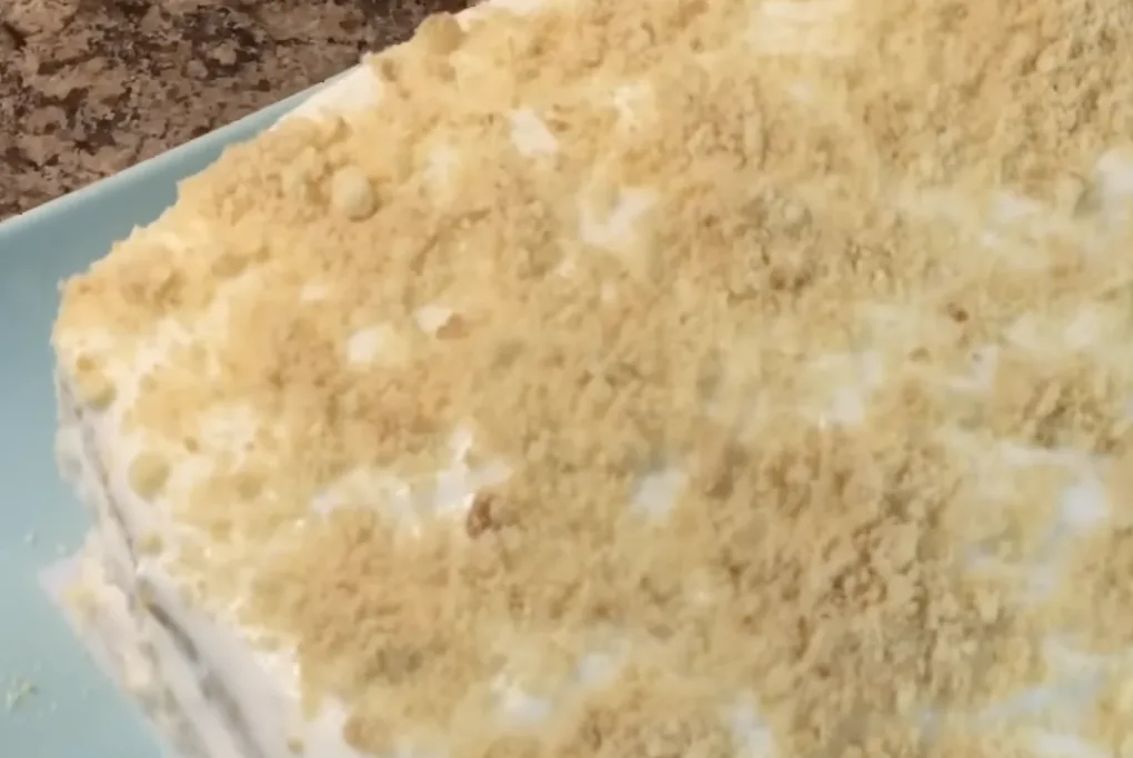 Охолоджений бісквіт розрізаю на кілька коржів і щедро змащую кожен кремом. Зібраний торт покриваю кремом зверху та з боків, посипаю крихтою і обов’язково ставлю в холодильник настоюватися. Смачного!