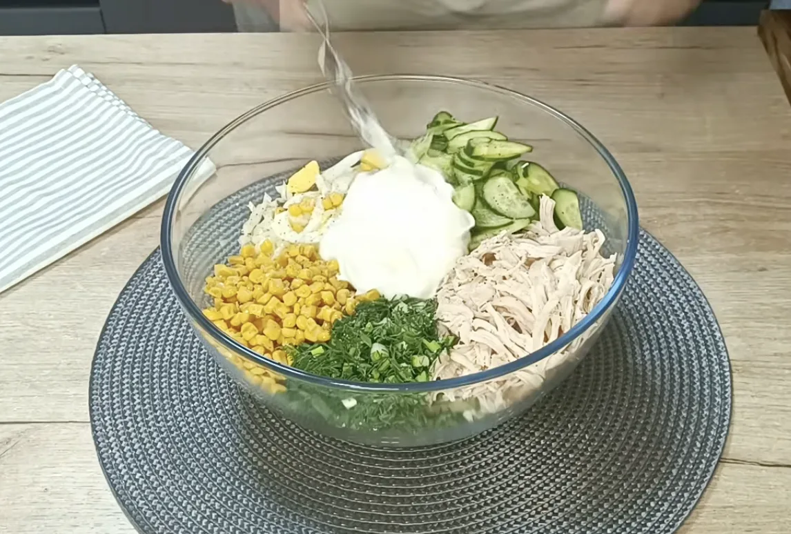 У великій мисці з’єдную всі інгредієнти: пекінську капусту, куряче філе, огірок, зелень і яйце. Додаю приблизно 120 грамів консервованої кукурудзи, солю і перчу за смаком. Заправляю трьома столовими ложками грецького йогурту і все добре перемішую. Грецький йогурт можна замінити сметаною, можна зробити заправку з олії та гірчиці.