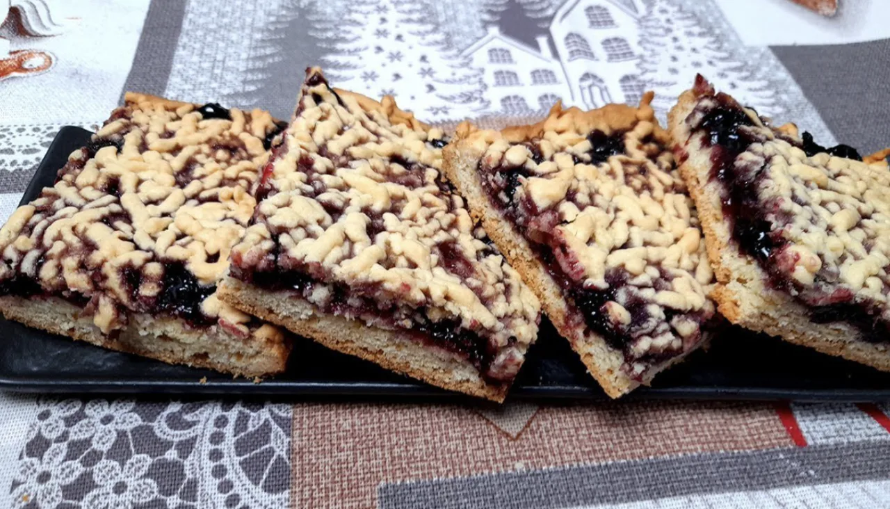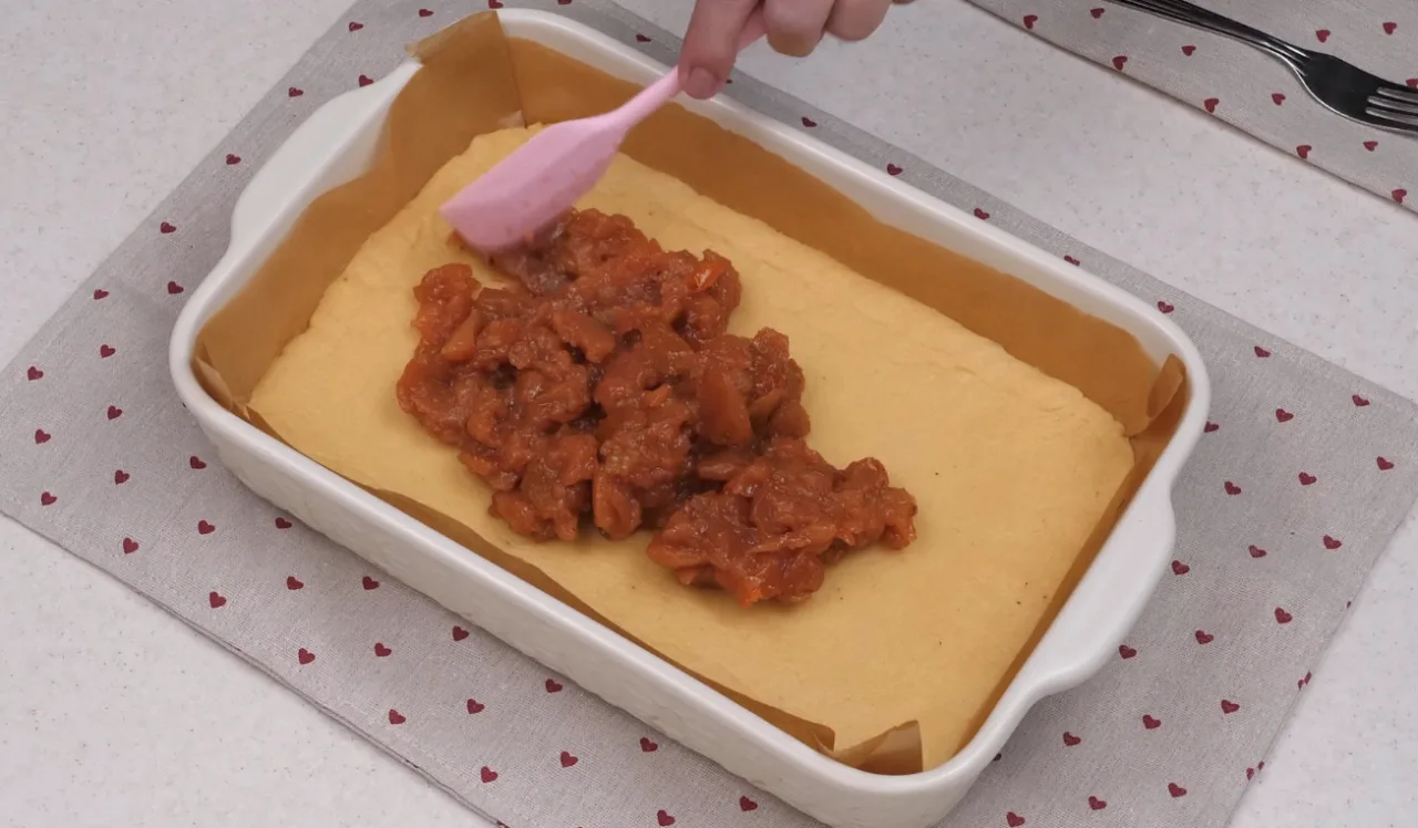 Поки охолоджується тісто, форму змастіть маслом і викладіть більшу частину тіста рівним шаром. Начинку розподіліть рівномірно, а зверху натріть заморожену частину тіста, саме вона створює ту хрустку, розсипчасту скоринку.