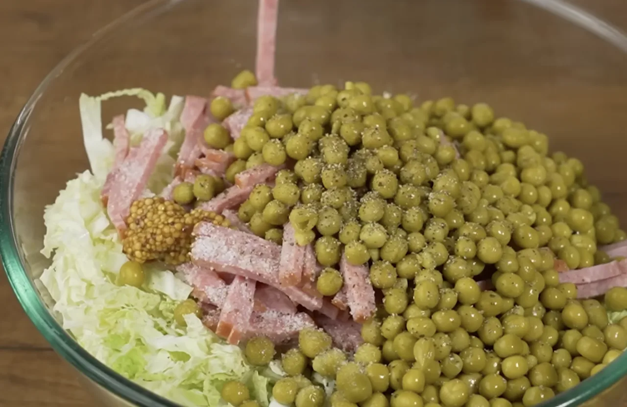 У велику миску викладаю капусту, додаю ковбасу та всипаю горошок (попередньо зливаю рідину). Трохи солю, але зовсім небагато, адже і ковбаса, і горошок уже мають сіль. Додаю чорний мелений перець.