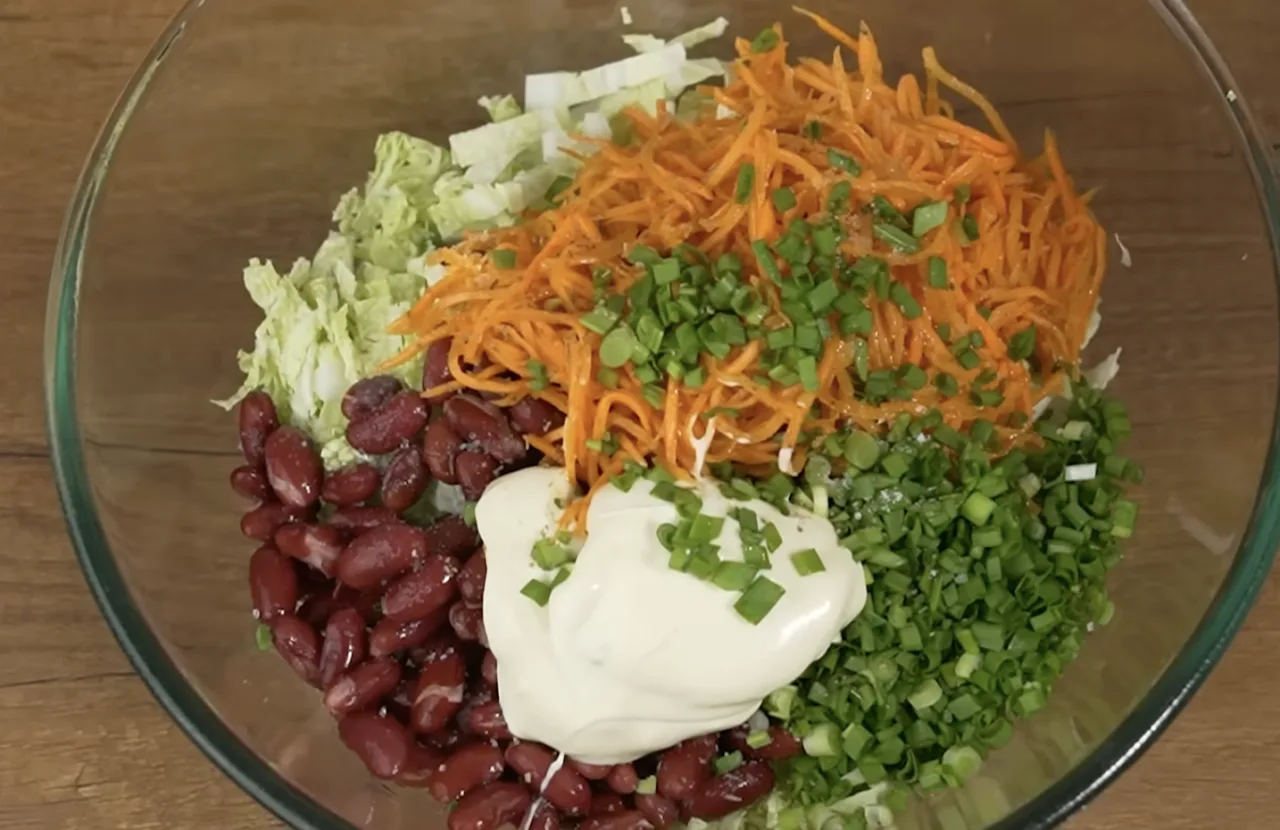 Цей салат підкорює з першої ложки: хрумка капуста, пікантна морква, ситна квасоля та ніжна заправка створюють ідеальне поєднання. Недарма господині кажуть, що його можна «їсти відрами».