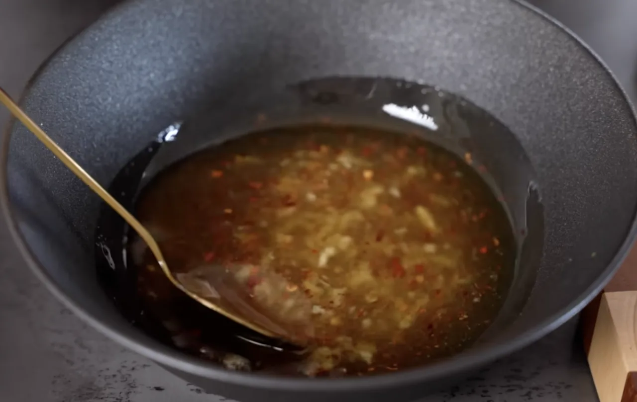 У мисці змішайте оливкову олію, оцет, сіль, цукор, чорний і червоний перець та подрібнений часник. Ретельно перемішайте до однорідності.
