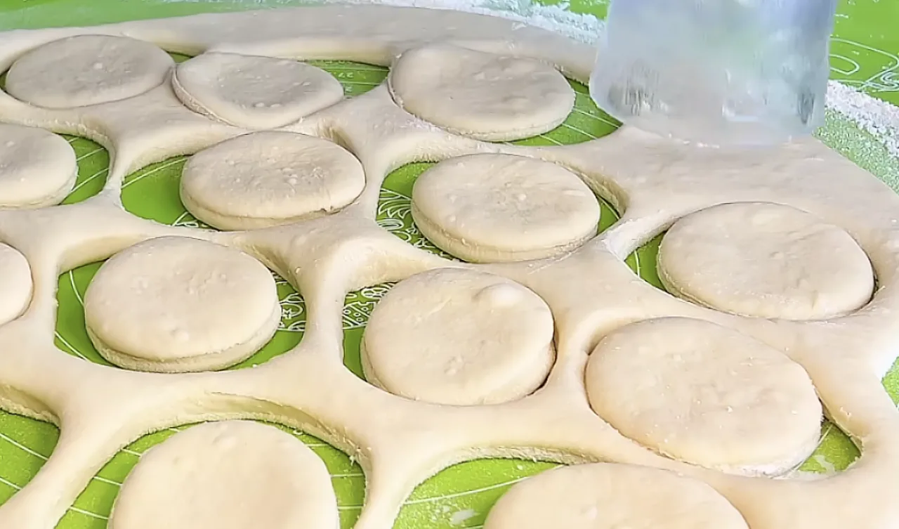 Змащую тісто краплею олії, накриваю й залишаю відпочити на 10–15 хвилин. Тісто трохи обминаю, викладаю на припилену борошном поверхню та розкачую у пласт товщиною близько 1 см. Вирізаю кружечки склянкою або нарізаю ромбиками. Заготовки накриваю рушником, щоб вони не підсихали.