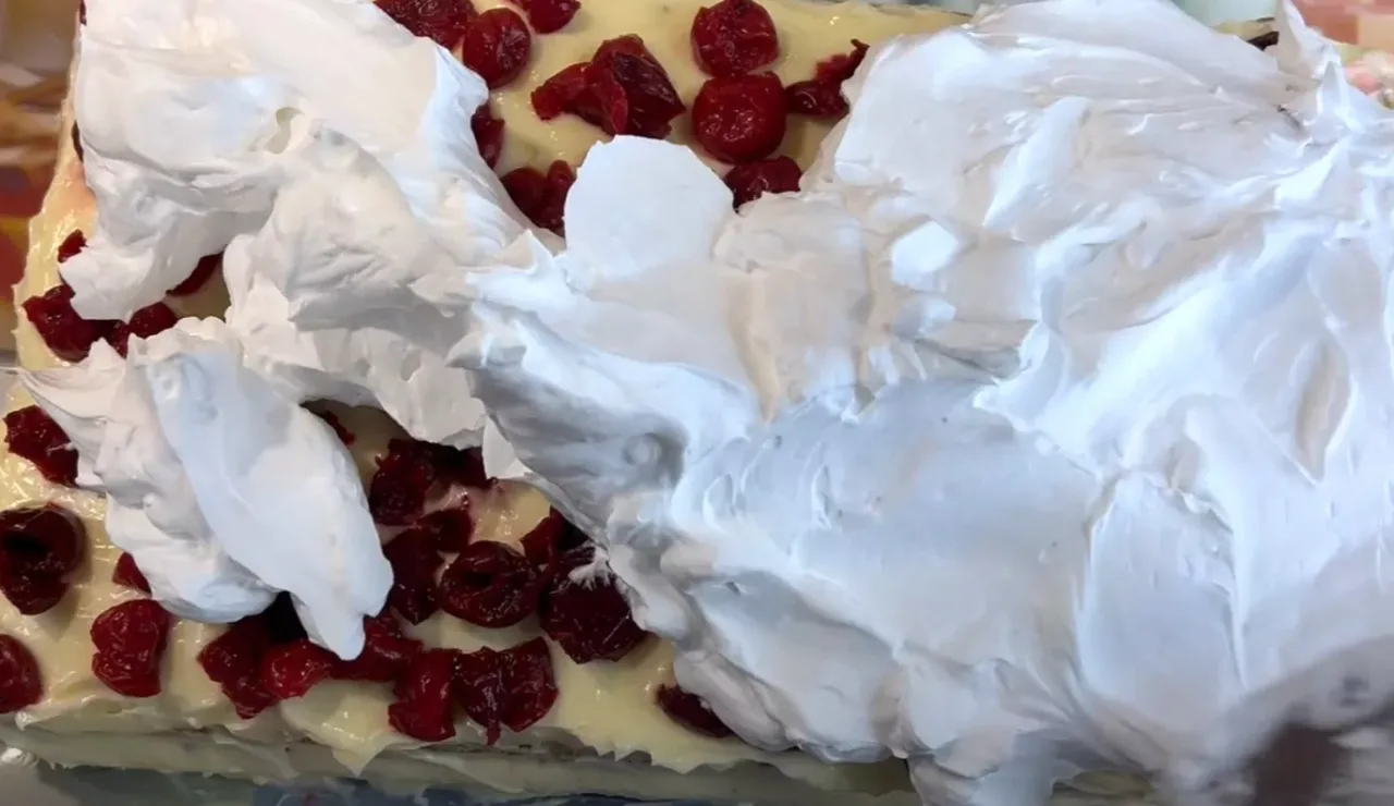 Корж розрізаю на два пласти. На нижній наношу шар крему й викладаю частину вишень. Накриваю другим коржем і повторюю шари, змащую також боки.