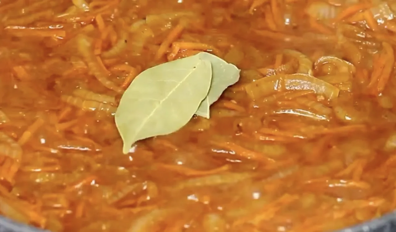 Влити воду, додати сіль і лавровий лист, довести соус до кипіння. У викладений соус обережно покласти шматочки риби, накрити кришкою та тушкувати на слабкому вогні 15–20 хвилин, поки риба стане м’якою і добре просочиться соусом. Наприкінці додати оцет, акуратно перемішати та зняти з вогню.