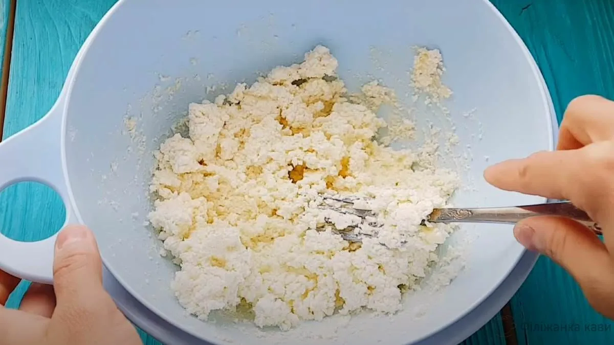 Просіяти борошно і половину ввести в сир. Туди ж відправити пекарський порошок, який можна змішати з борошном. Перемішати.