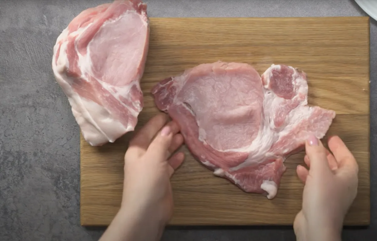 М’ясо нарізати скибочками товщиною 2 см, відбити кухонним молоточком, посолити і поперчити за смаком кожну скибочку з обох боків.