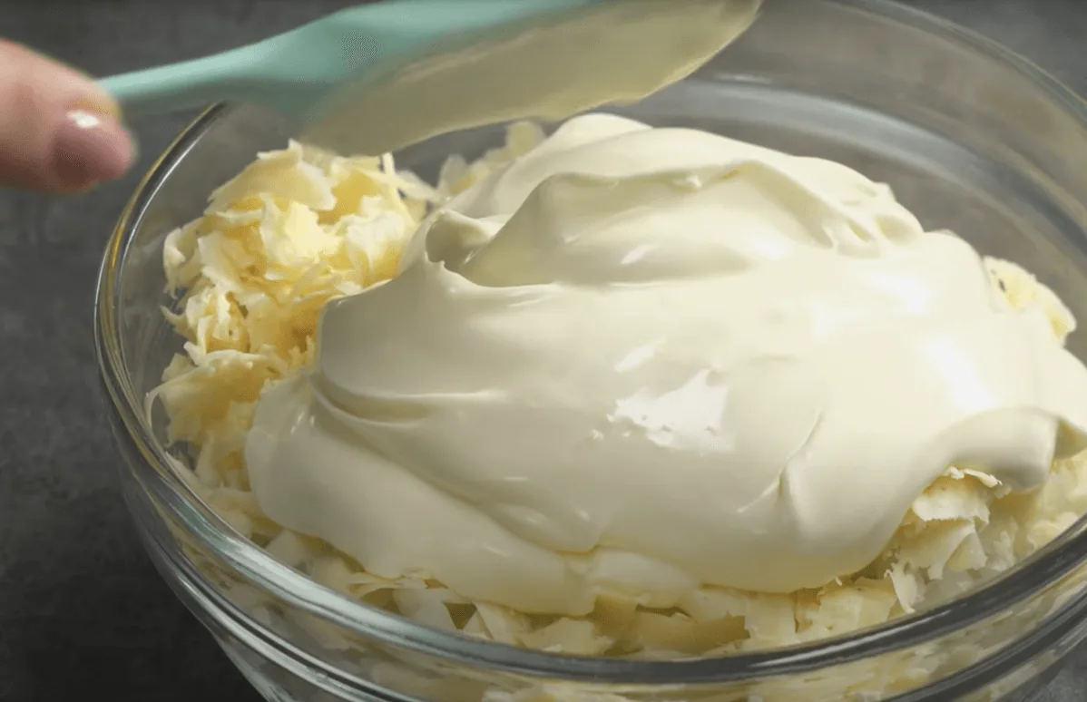 У мисці змішати майонез, дрібно нарізану цибулю і натертий сир.