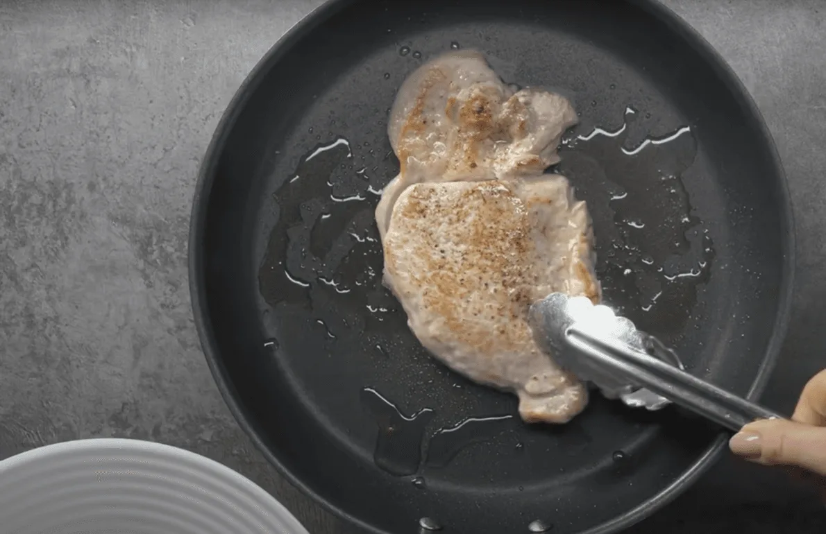 Нагріти сковороду, додати 2 ст.л. олії та обсмажити м’ясо по 30 секунд з кожного боку на сильному вогні.