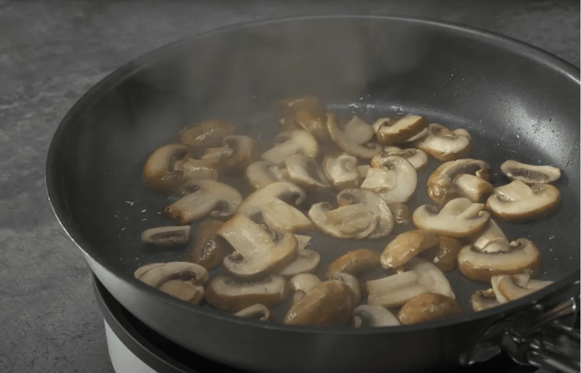 Печериці нарізати пластинами, розігріти сковороду на сильному вогні, додати 20 г вершкового масла і обсмажити гриби 3-4 хвилини на середньому вогні.