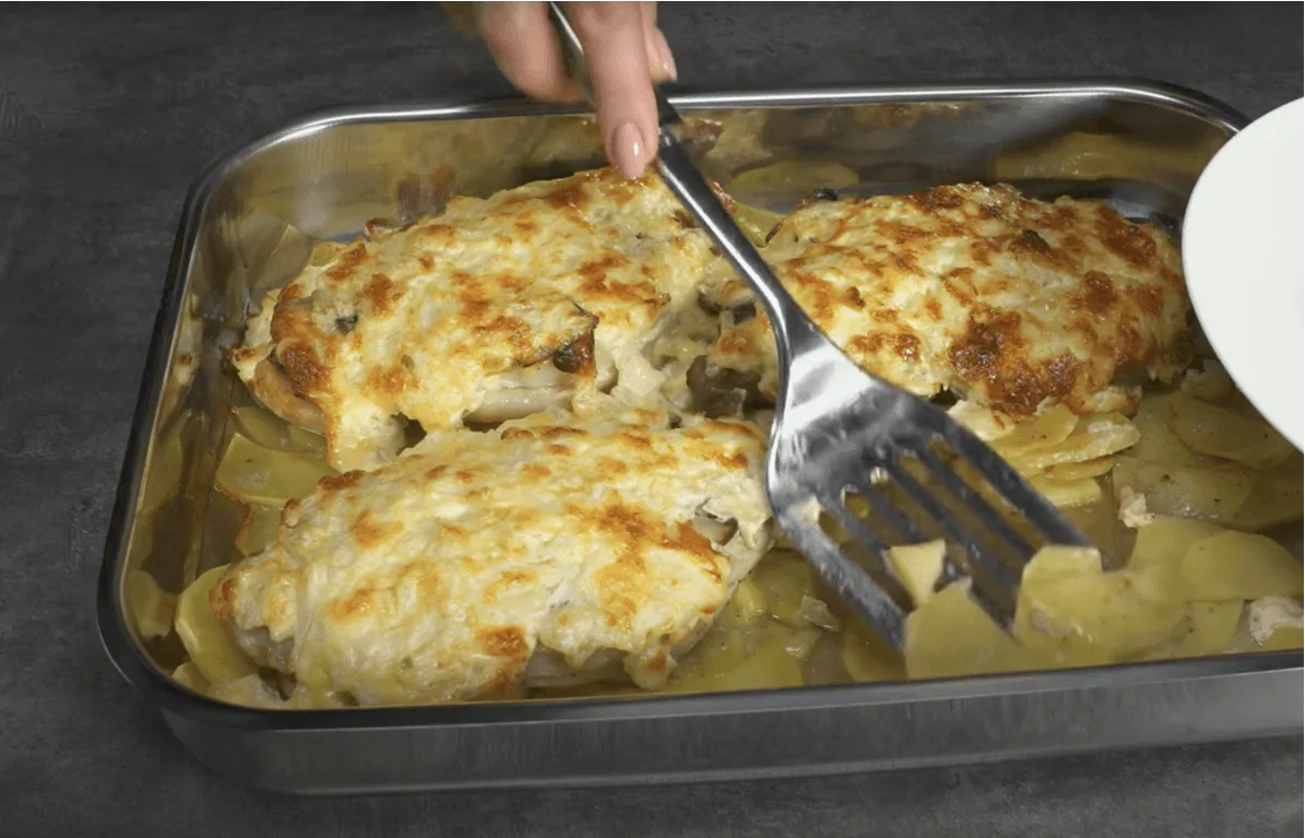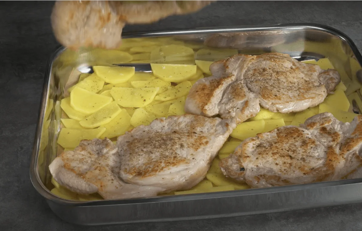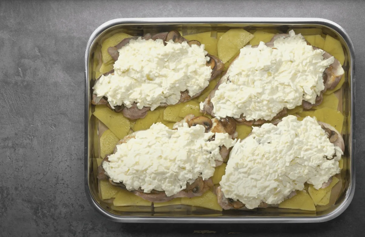 Популярне «М’ясо по-французьки» традиційно готують до свят або просто на обід. Соковиті скибочки свинини корейки, запечені з грибами та сиром на картопляній подушці. Страва не вимагає спеціальних навичок для приготування і завжди виходить ефектною, святковою та дуже смачною.