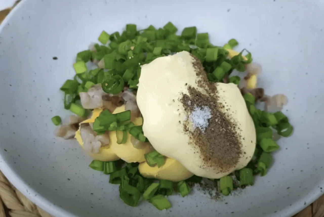 Сюди ж додаємо зелену цибулю, майонез, сіль, перець. Перемішуємо.