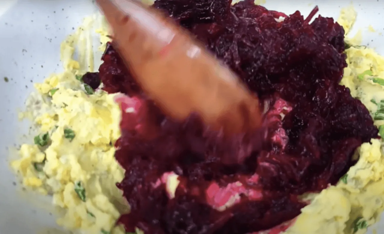До цієї суміші додаємо натертий варений буряк і ще раз гарненько перемішуємо.