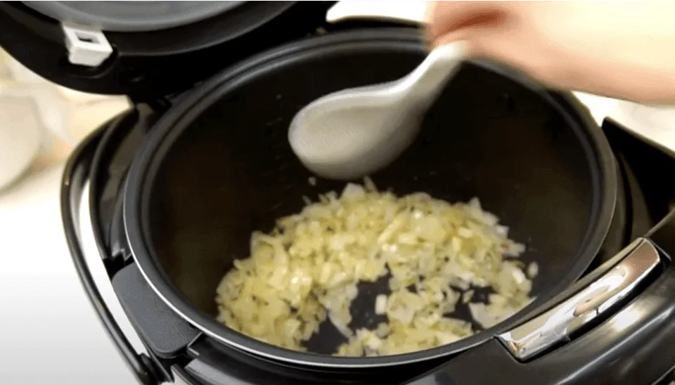 Цибулю поріжемо кубиками. Готую я її в мультиварці, встановлюю режим смаження і обсмажую цибулю до готовності, іноді перемішую, щоб не підгоріла. Тепер цибулю прибираю із чаші мультиварки.