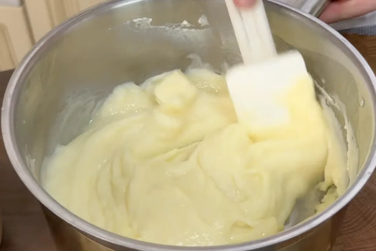 Половину холодного молока змішую з яйцями, цукром, ванільним цукром і кукурудзяним крохмалем. Добре розмішую вінчиком, щоб не було грудочок, після чого додаю решту молока. Ставлю суміш на середній вогонь і постійно помішую. Крем загусає дуже швидко — буквально за кілька хвилин. Як тільки з’являються перші бульбашки, одразу знімаю з плити. Додаю вершкове масло і перемішую до гладкої, шовковистої консистенції. Даю крему постояти 5 хвилин — він має бути теплим, але не гарячим.