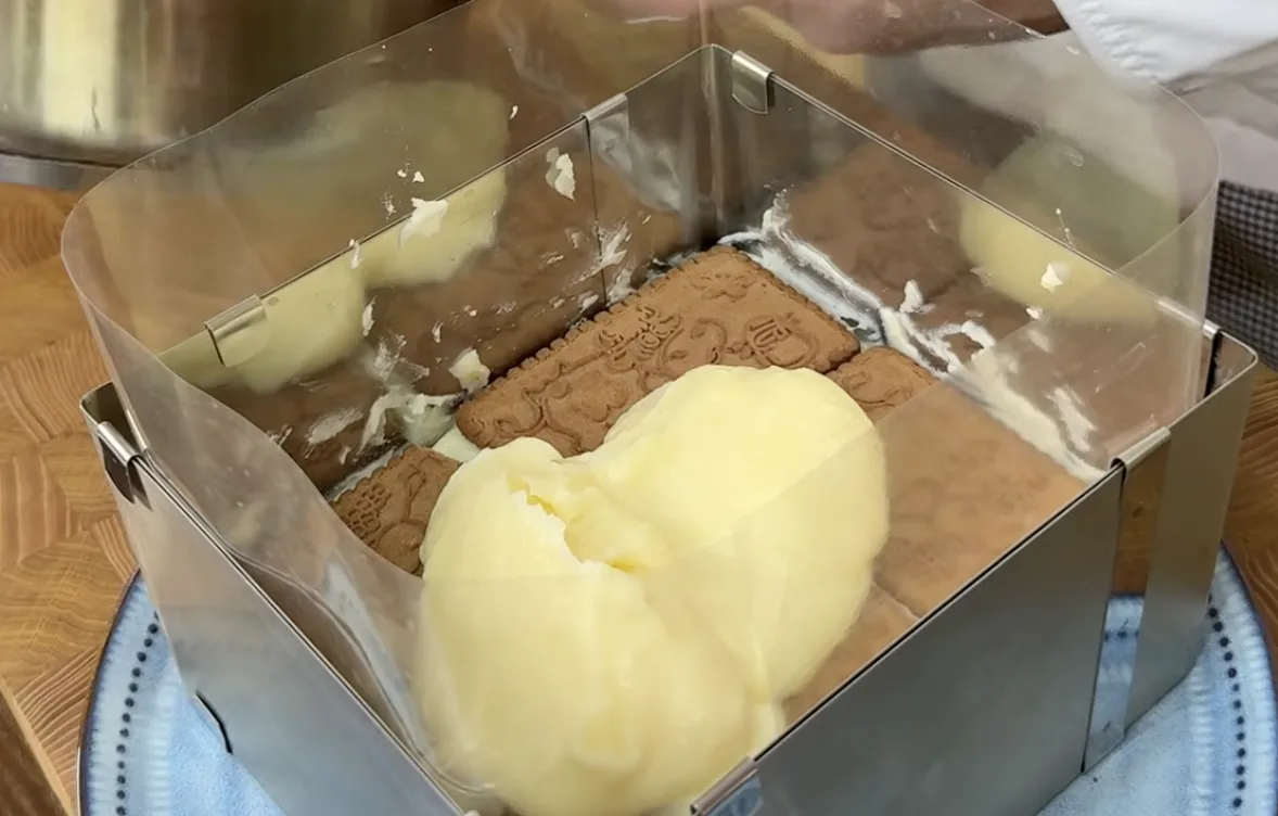 Форму (приблизно 20×20 см) застеляю ацетатною плівкою або пергаментом. Викладаю шар печива, якщо потрібно — ламаю його руками. Зверху — шар крему. Так чергую шари печива і крему, поки все не закінчиться. Останній шар завжди кремовий. Накриваю плівкою «в контакт» і ставлю торт у холодильник на 30–40 хвилин.