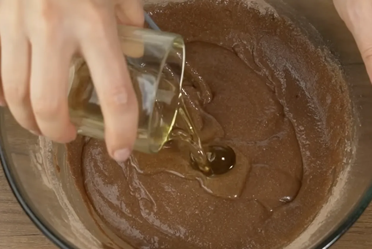 У миску всипаємо манку і цукор, заливаємо водою, добре перемішуємо та залишаємо на 20–30 хвилин, щоб манка набухла. Додаємо борошно, какао, розпушувач і щіпку солі, усе просіюємо та ретельно перемішуємо до однорідності. Вливаємо рослинну олію і ще раз добре перемішуємо тісто.