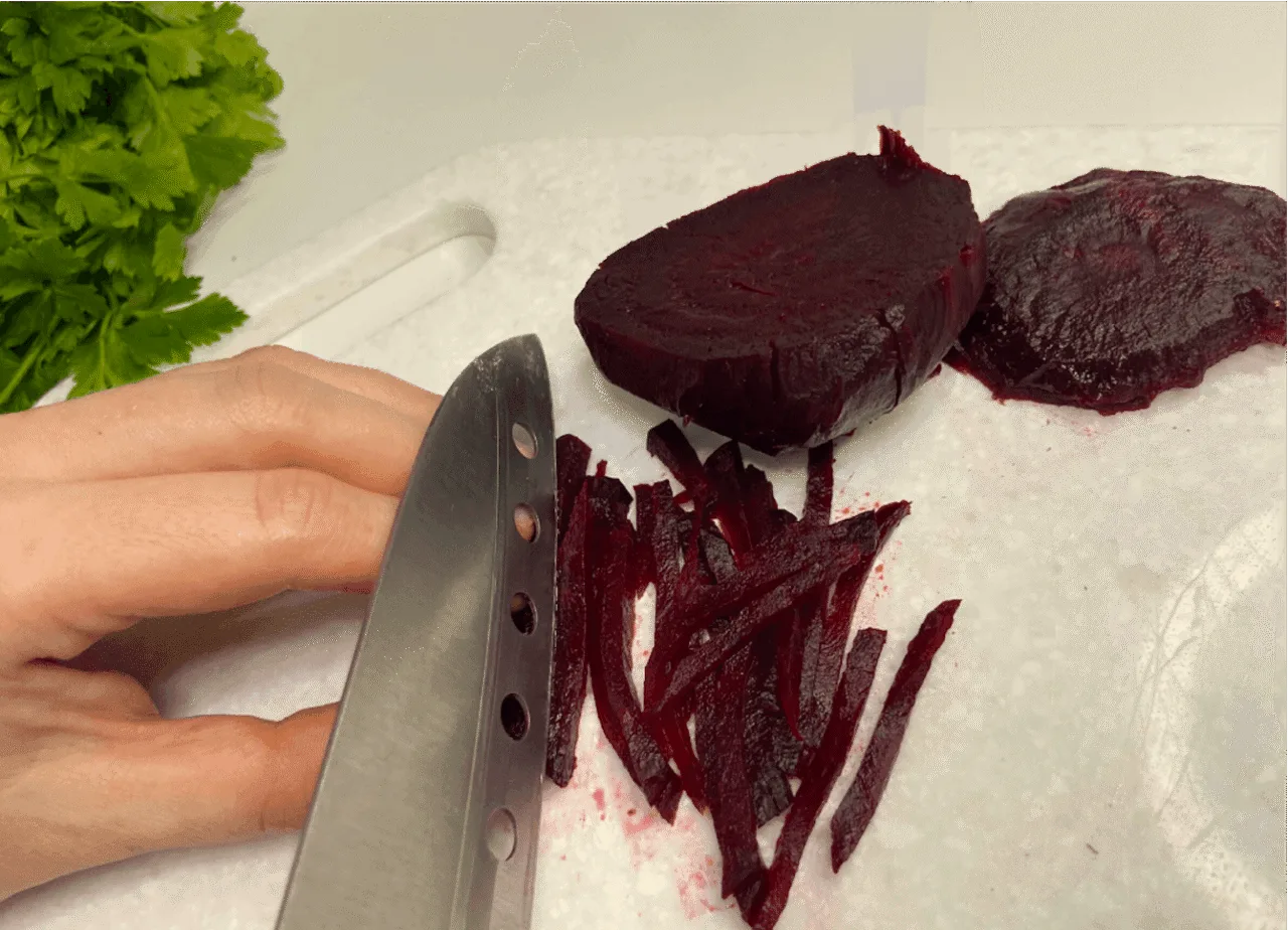 Охолоджений і очищений буряк наріжте тоненькою соломкою. Раджу нарізати ножем, інакше на тертці вийде зовсім не той смак.