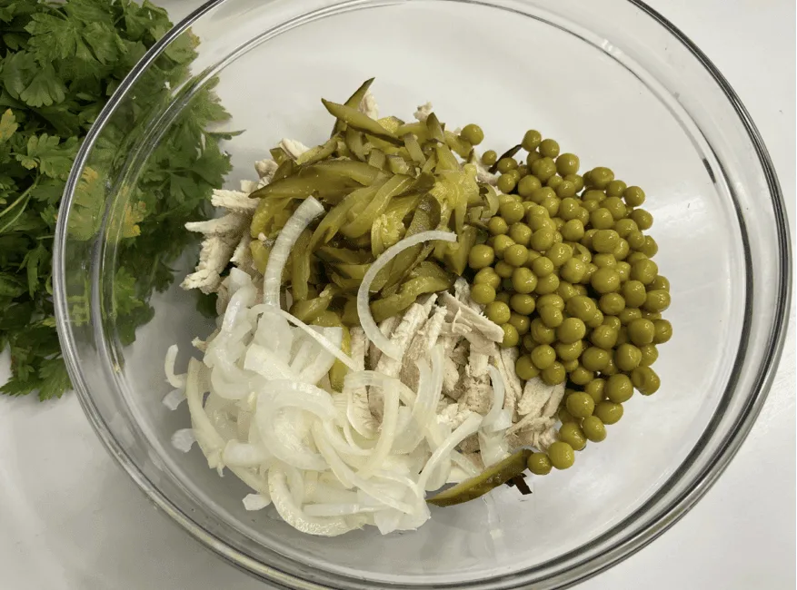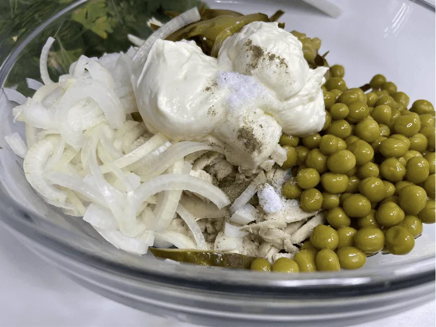 У глибокому салатнику з’єднайте всі нарізані інгредієнти та мариновану цибулю, додайте ще консервований зелений горошок.