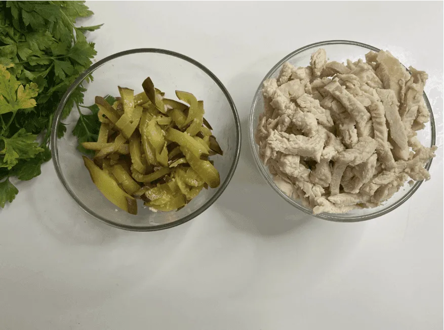 Відваріть м’ясо в підсоленій воді, в оригінальному рецепті використовують яловичину, але в мене була вже готова куряча грудка, з нею салат вийшов нічим не гіршим. М’ясу бажано дати охолонути прямий у бульйоні, так воно вийде соковитіше. Наріжте соломкою.