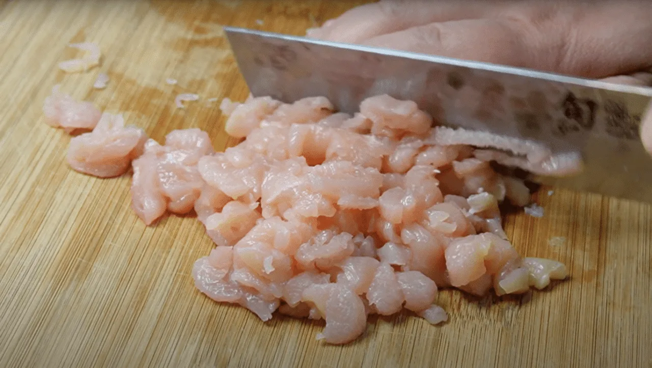 Куряче філе нарізаємо якомога дрібніше.