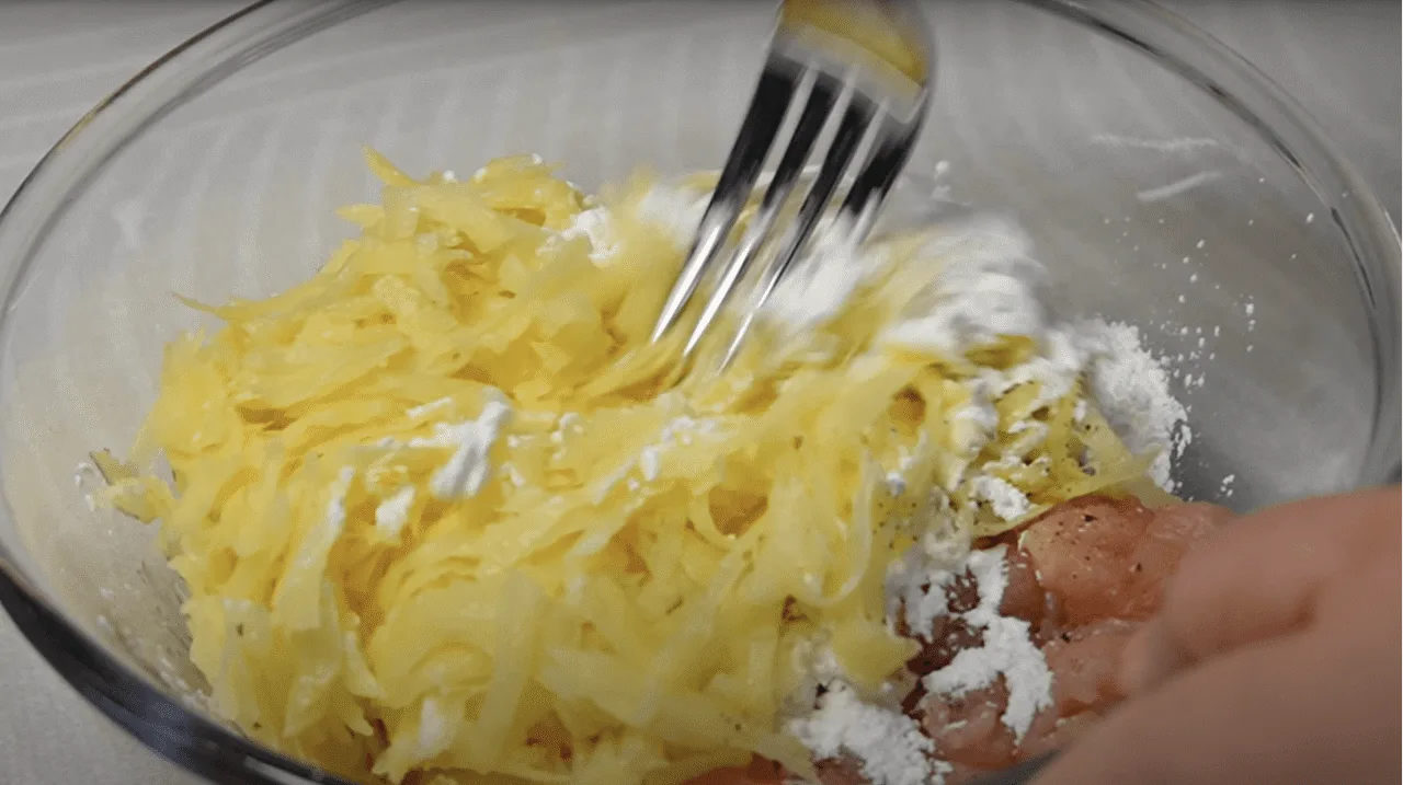 Змішуємо в мисці інгредієнти, додаємо спеції та крохмаль. Все гарненько перемішуємо.